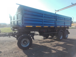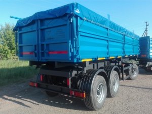 Трехосный прицеп зерновоз самосвал двухскатный 16 тонный с разгрузкой на две или три стороны, для перевозки зерновых культур и не только. Обычно идет в составе автопоезда КАМАЗ зерновоз с прицепом.